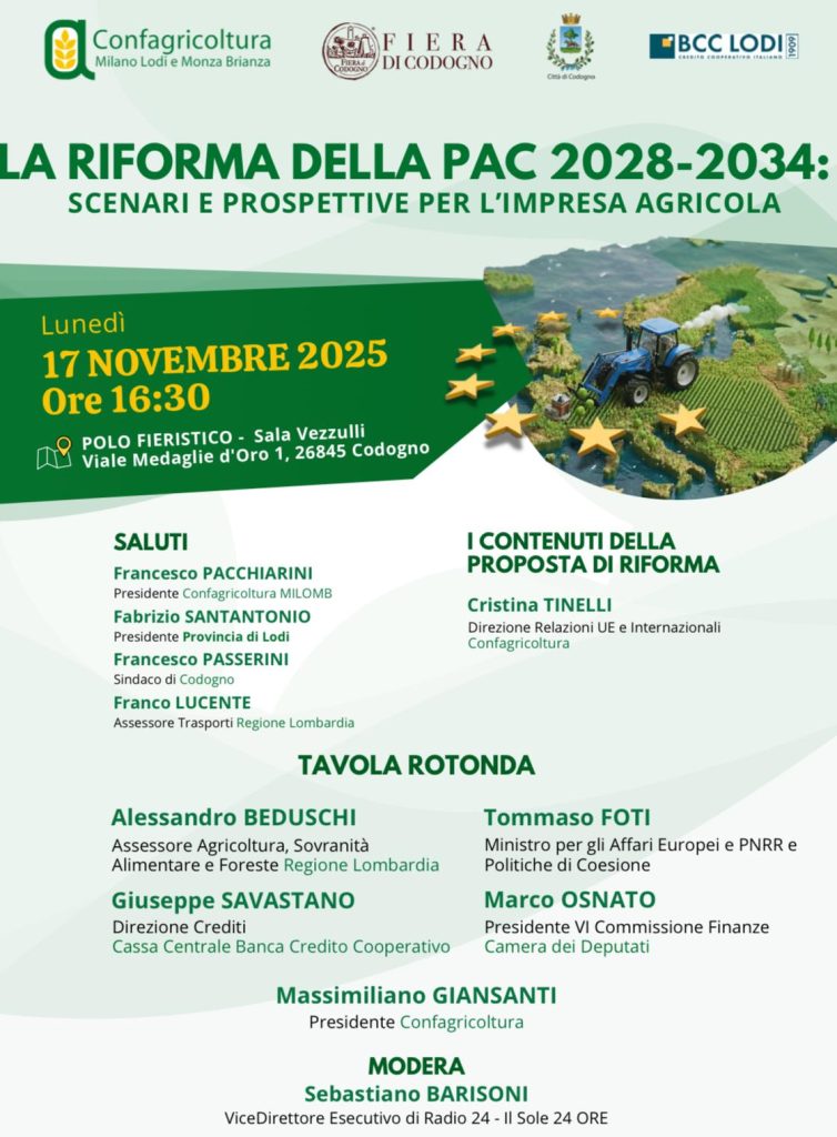 Si terrà lunedì 17 novembre 2025 alle 16.30 al Polo Fieristico di Codogno il convegno “La riforma della PAC 2028-2034: scenari e prospettive per l’impresa agricola”, promosso da Confagricoltura Milano-Lodi-Monza Brianza in collaborazione con Fiera di Codogno e Comune di Codogno, con il supporto di BCC Lodi.