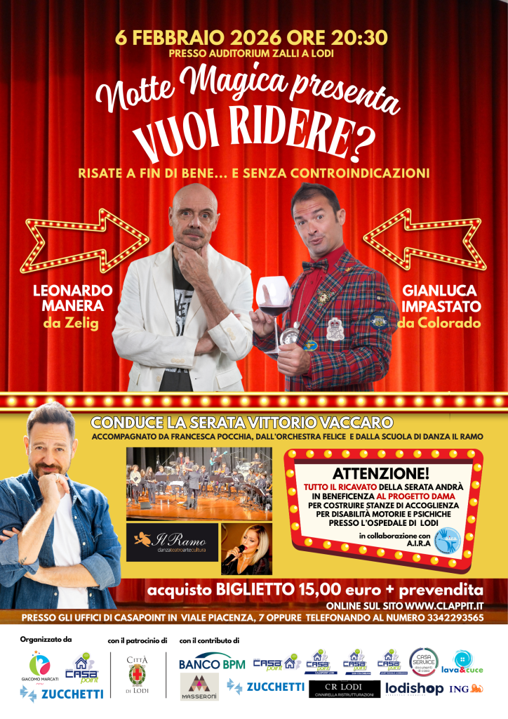 Una serata di risate che diventa un gesto concreto di solidarietà. Venerdì 6 febbraio 2026, alle 20.30, l’Auditorium Tiziano Zalli ospiterà “Notte Magica presenta: Vuoi ridere?”, spettacolo benefico promosso da Casapoint Lodi, Associazione Giacomo Marcati ODV e Zucchetti, con il patrocinio del Comune di Lodi.