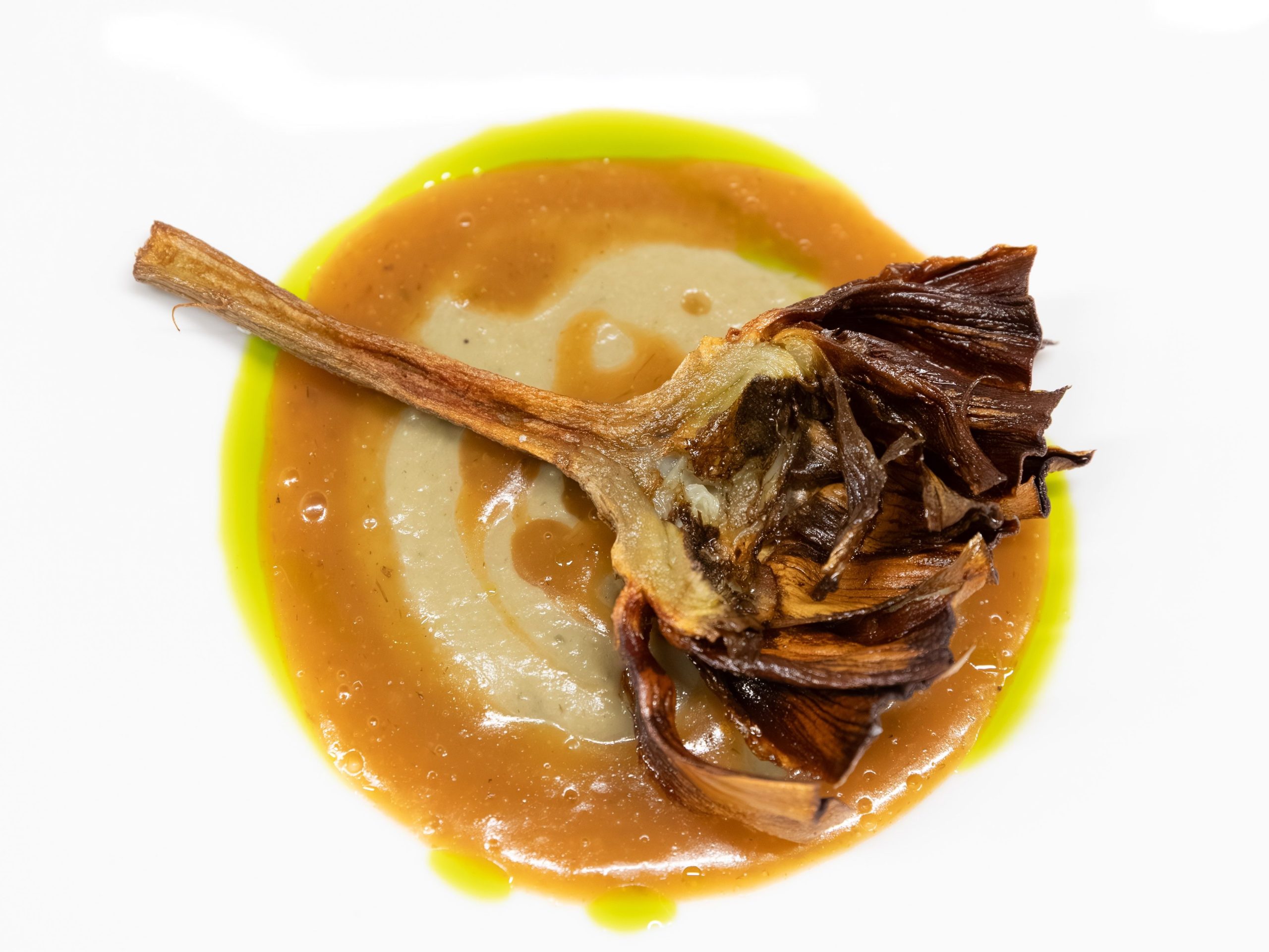 La melanzana fritta con salsa teriyaki, manzo e spuma di popcorn rompe gli schemi e dimostra come la cucina lodigiana possa dialogare con il mondo senza perdere identità. Segue l’assoluto di carciofo, lavorato in ogni sua parte per concentrarne il sapore e trasformarlo in un piatto deciso e contemporaneo.