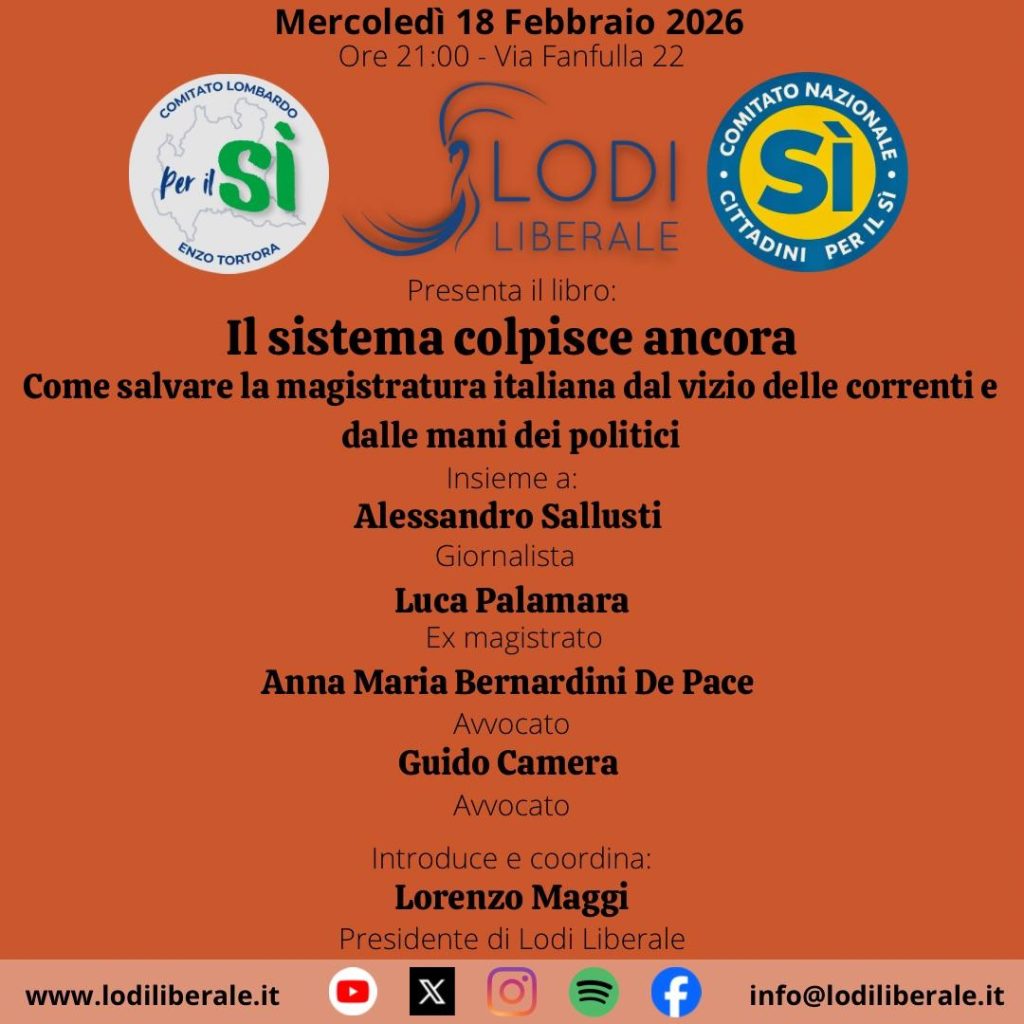 Giustizia, correnti e riforme: temi che tornano al centro del dibattito pubblico anche in vista del referendum previsto per il 22-23 marzo. Questa sera, mercoledì 18 febbraio alle ore 21, in via Fanfulla 22 a Lodi, si terrà la presentazione del libro “Il sistema colpisce ancora. Come salvare la magistratura italiana dal vizio delle correnti e dalle mani dei politici”.