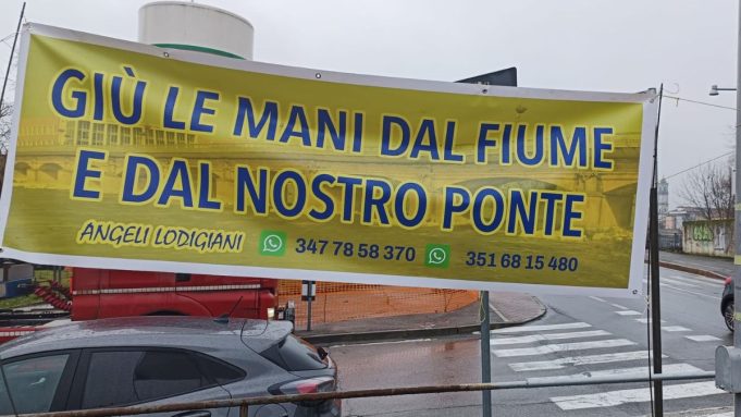 “Rischio di crollo”, non del ponte ma dell’economia cittadina. È questa la lettura di chi si oppone al progetto AIPO per la realizzazione della nuova campata del ponte di Lodi. Tra le voci più critiche c’è quella del movimento Angeli Lodigiani, fondato da Stefano Rotta e dal consigliere comunale Gianmario Invernizzi, che questa mattina ha esposto uno striscione di protesta con la scritta: “Giù le mani dal fiume e dal nostro ponte”.