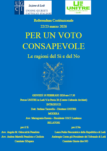 Un confronto pubblico, aperto alla cittadinanza, per orientarsi tra le ragioni del Sì e del No in vista del referendum costituzionale del 22 e 23 marzo 2026. È questo l’obiettivo dell’iniziativa promossa a Lodi dall’Unione Giuristi Cattolici Italiani – sezione di Lodi – in collaborazione con Unitre.