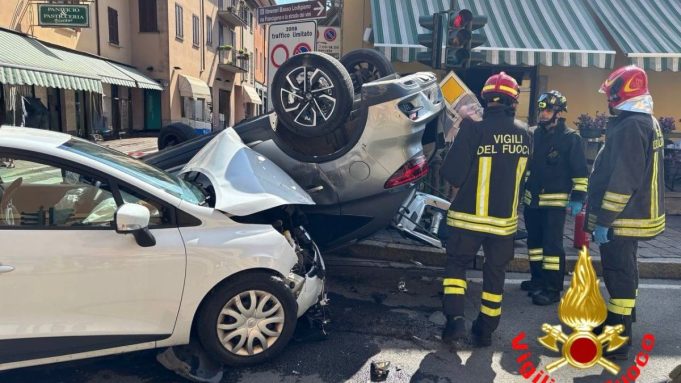 Attimi di paura oggi pomeriggio, intorno alle 14.30, in pieno centro a San Colombano al Lambro. All’incrocio tra via Mazzini e via Steffenini due auto si sono scontrate violentemente e una delle vetture si è ribaltata, finendo capovolta sulla carreggiata e stretta tra i paletti dissuasori del marciapiede, a pochi passi dai tavolini del Bar Corso.
